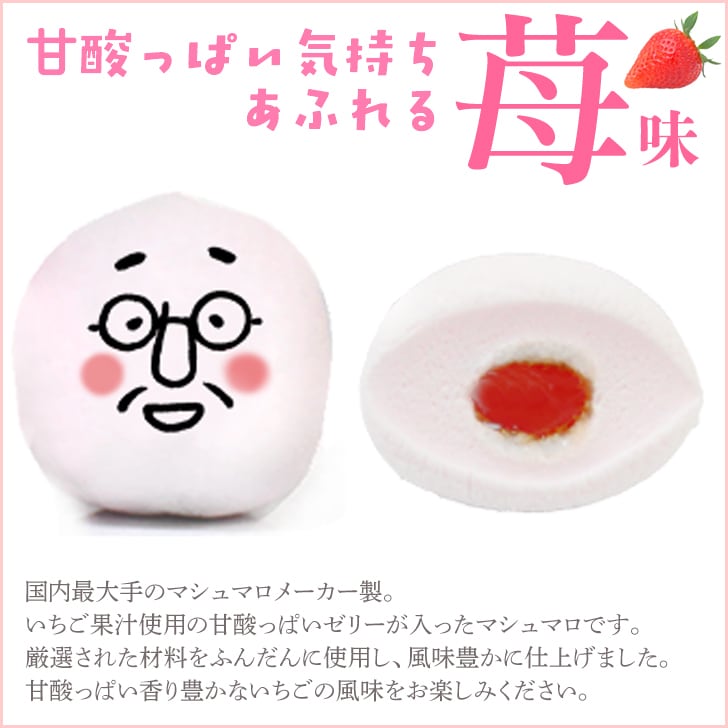 国内最大のマシュマロメーカー製。マシュマロの中に入った濃縮いちご果汁でお味も楽しめます。