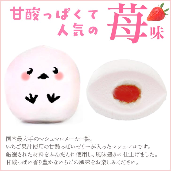 マシュマロの中に入った濃縮いちご果汁でお味も楽しめます。