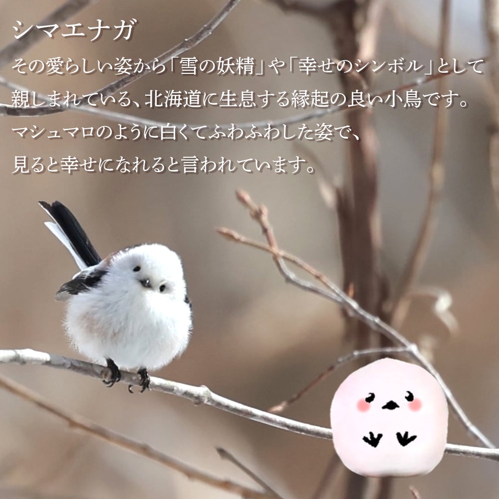シマエナガは、その愛らしい姿から「雪の妖精」や「幸せのシンボル」として親しまれている北海道に生息する縁起の良い小鳥です。見ると幸せになれると言われています。